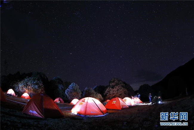 4月23日,來(lái)自攀枝花市的戶外愛(ài)好者在龍頭山露營(yíng)。 近日,四川省攀枝花市鹽邊縣龍頭山十余萬(wàn)畝野生杜鵑花盛開(kāi),吸引省內(nèi)外游客前來(lái)登山賞花。 龍頭山位于四川省攀枝花市鹽邊縣北部的紅寶苗族彝族鄉(xiāng)境內(nèi),這里的野生杜鵑花花期為2月至5月。 新華社記者 江宏景 攝