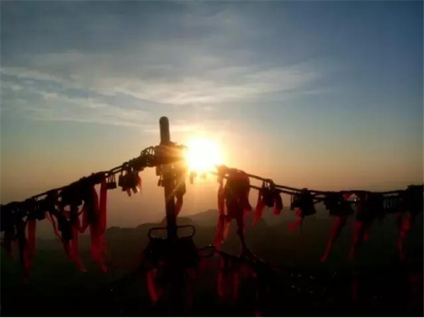 華山是一座愛情的殿堂,華山上的愛情故事悲烈、凄美而感人。我們曾經(jīng)為世界上許許多多的愛情故事所感動。其實,發(fā)生在華山上的愛情故事一樣讓人的心情無法平靜。眾所周知的神話傳說《寶蓮燈》中,三圣母為了愛情,被二郎神巨石壓在華山頂上;弄玉為了愛情,逃離安逸的生活,與蕭史雙雙來到華山,琴瑟合鳴;漢臣王咸不畏艱險,到華山尋找賢妻南陽公主等等這些愛情故事,感天動地,流傳不衰,不知讓多少人為之贊嘆。也許是讓華山上這些動人的愛情故事所感染,不知從什么時候開始,在代表著堅實連接的一串串鐵鏈上,游人掛上了閃閃的金鎖,把矢志不渝的愛情鎖在華山上,在華山的見證下,祝愿自己的愛情如同華山一樣永遠(yuǎn)不會改變。