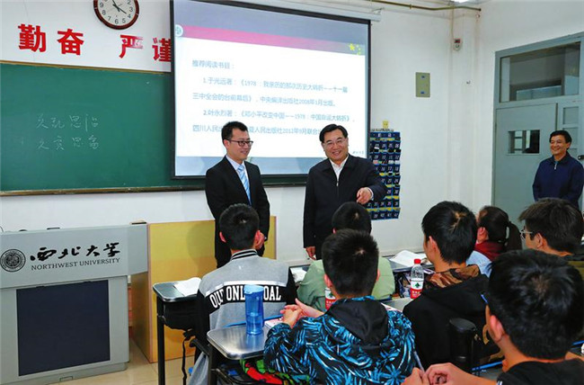 4月28日,省委書記胡和平到西北大學(xué)調(diào)研學(xué)校思想政治理論課建設(shè)情況。胡和平隨堂聽取趙沛老師講授的毛澤東思想和中國特色社會主義理論體系概論,并與師生交流學(xué)習(xí)感想。 記者 宋紅梅攝