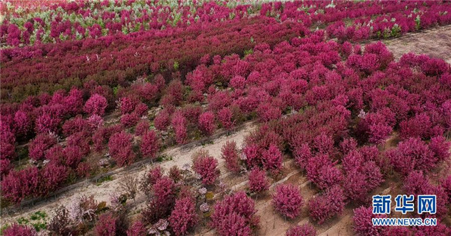 呼圖壁縣二十里店鎮(zhèn)北美海棠園內(nèi)的海棠花競(jìng)相開放(4月28日無(wú)人機(jī)拍攝)。
