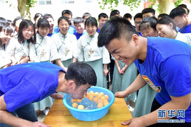 5月14日,河北省唐山遵化市堡子店中學(xué)高三學(xué)生在進行投乒乓球游戲。 新華社發(fā)(劉滿倉 攝)
