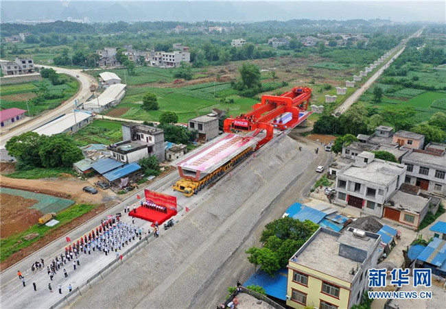 在廣西都安瑤族自治縣貴南高鐵澄江雙線(xiàn)特大橋施工現(xiàn)場(chǎng),工人在架設(shè)大橋首榀箱梁(4月29日無(wú)人機(jī)拍攝)。 新華社記者 陸波岸 攝