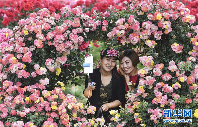 5月16日,游人在新下社區(qū)扶貧產(chǎn)業(yè)園月季苗圃自拍。 新華社記者 陶明 攝
