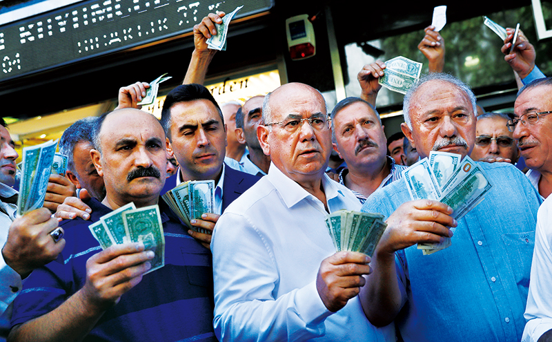 2018年,由于美聯(lián)儲加息導致國際游資大規(guī)?;亓?,美國對土耳其、伊朗進行制裁以及貿(mào)易保護主義的影響,俄羅斯、阿根廷、土耳其、南非等不少經(jīng)濟體貨幣遭遇大幅貶值。圖為2018年8月14日,在土耳其首都安卡拉,人們響應政府號召,手持美元站在貨幣兌換處前,出售手中的美元支持本國貨幣里拉。 新華社/路透