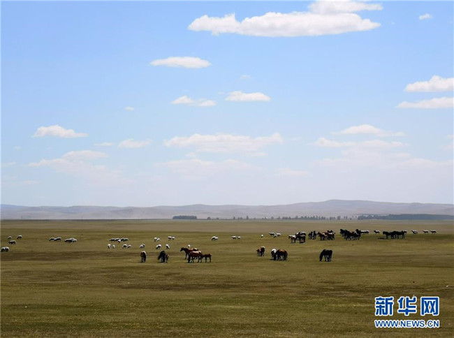 5月22日,成群的馬和羊在內(nèi)蒙古呼倫貝爾市新巴爾虎左旗境內(nèi)的草原上吃草(手機拍攝)。近期,隨著降雨量增多、氣溫回暖,內(nèi)蒙古草原陸續(xù)進入返青期。新華社記者殷耀攝