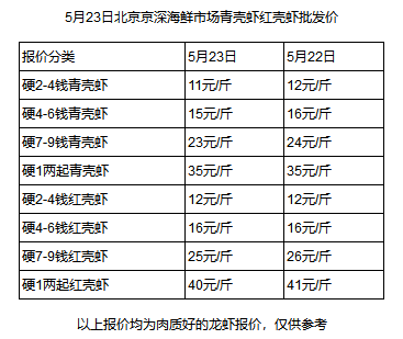 水產(chǎn)養(yǎng)殖網(wǎng)今早上傳的5月23日北京京深海鮮市場(chǎng)紅殼蝦青殼蝦批發(fā)價(jià)顯示,個(gè)頭最小(2-4錢(qián)/只)、最便宜的小龍蝦批發(fā)價(jià)僅需11元/斤,比昨天又降了1元。而湖南、江蘇、廣東等地的價(jià)格也和北京差不多,武漢甚至低至9元/斤。