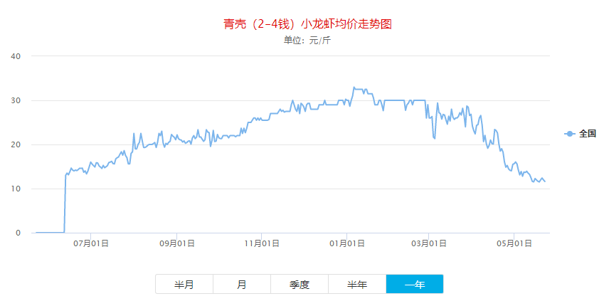 小龍蝦價(jià)格網(wǎng)上發(fā)布的全國(guó)小龍蝦批發(fā)價(jià)走勢(shì)圖也顯示,近日價(jià)格為一年中的低點(diǎn),均價(jià)在11元上下。
