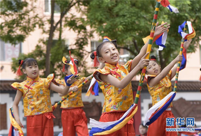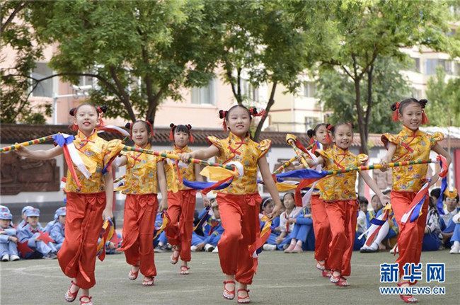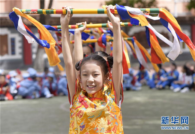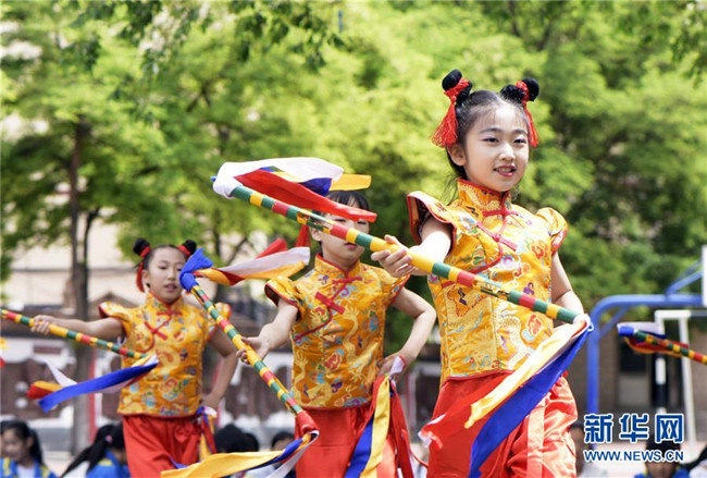 5月30日,呼和浩特市新城區(qū)滿族小學(xué)的學(xué)生在表演滿族花棍舞。