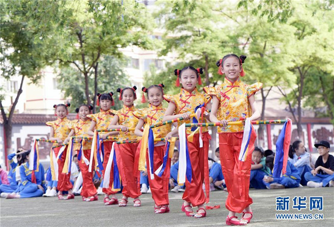 當(dāng)日,內(nèi)蒙古呼和浩特市新城區(qū)滿族小學(xué)舉辦“繽紛民族情 炫彩花棍舞”主題活動,學(xué)生們身著艷麗的滿族服飾,跳起優(yōu)美飄逸的滿族花棍舞,在濃郁的民族文化氛圍中迎接即將到來的“六一”兒童節(jié)。 新華社發(fā)(王正 攝)