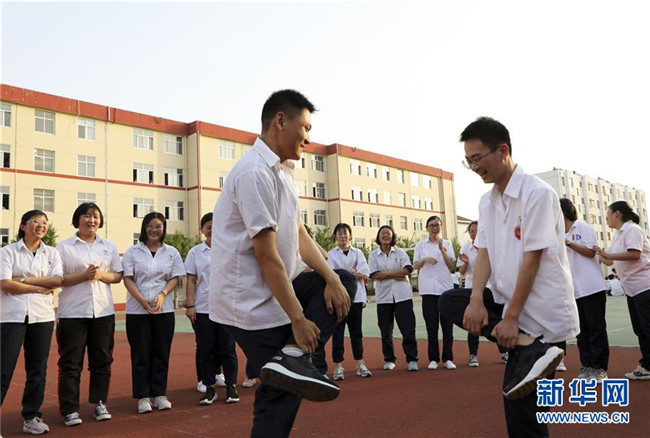 6月2日,在山東省濱州市博興縣第三中學(xué),高三學(xué)生在操場(chǎng)上做游戲放松心情。新華社發(fā)(陳彬 攝)