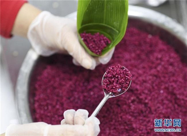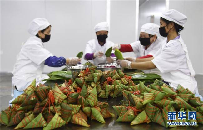 6月2日,在臺江縣一家食品生產(chǎn)企業(yè)車間,工人在包制五彩粽。 新華社發(fā)(劉開福 攝)