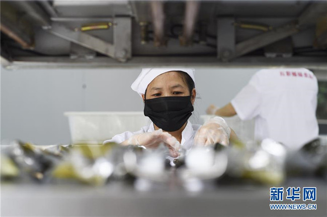 6月2日,在臺江縣一家食品生產(chǎn)企業(yè)車間,工人將煮熟的五彩粽進行真空包裝?!⌒氯A社發(fā)(劉開福 攝)