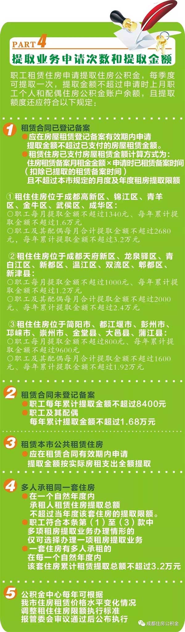 人民網(wǎng)成都6月3日電 (任重)為規(guī)范住房公積金提取管理,貫徹落實加快建立租購并舉住房制度,加大對市民租賃自住住房支出的政策支持力度,新修訂的《成都住房公積金提取管理辦法》對租房提取進行了優(yōu)化,將于今年9月1日正式實施。