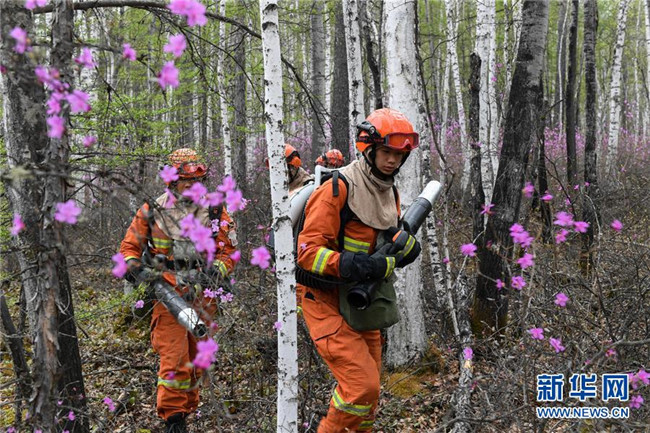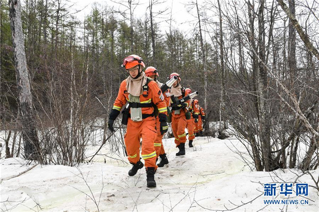 奇乾中隊(duì)消防隊(duì)員在戶外進(jìn)行綜合訓(xùn)練時(shí)經(jīng)過(guò)一片暫未消融的冰雪(5月19日攝)。新華社記者 劉磊 攝