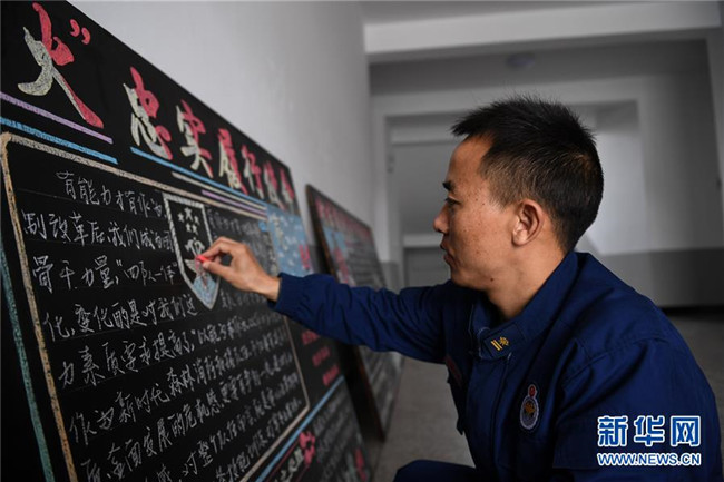 在奇乾中隊(duì)的營(yíng)地,來(lái)自四川大涼山的彝族小伙兒布約小兵用粉筆修飾黑板報(bào)(5月18日攝)。新華社記者 劉磊 攝
