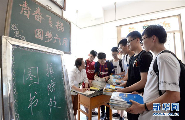 6月9日,在河北省邯鄲市第一中學(xué),高三畢業(yè)生整理同學(xué)們捐贈的書籍。