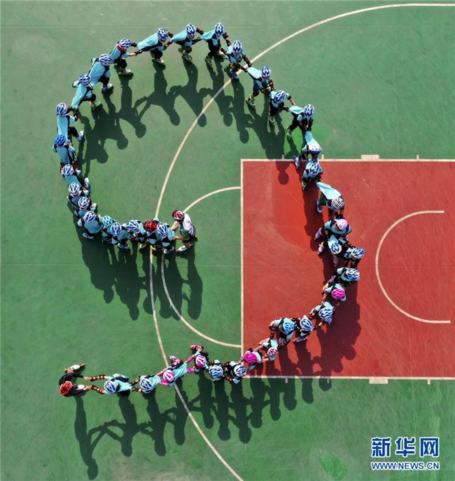 6月11日,學生輪滑隊員在遵化市第六實驗小學進行訓練(無人機拍攝)。