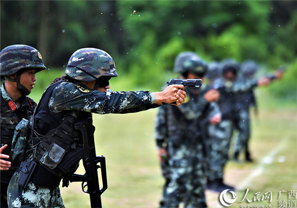 訓(xùn)練期間,射擊場突降大雨,雨水順著頭盔滑過特戰(zhàn)隊(duì)員們的臉龐,給射擊瞄準(zhǔn)帶來了不小的影響,在步手槍連續(xù)快速射擊課目中取了得10發(fā)10中好成績的特戰(zhàn)隊(duì)員林意鋒告訴筆者:“戰(zhàn)場上有很多不可預(yù)見性,幾秒鐘都可能決定成敗,我覺得無論刮風(fēng)下雨,只有牢牢掌握這種絕對快相對準(zhǔn)的射擊本領(lǐng),才能更高效地完成各類反恐處突任務(wù)。”(沈泉池、朱洋洋、余海洋)