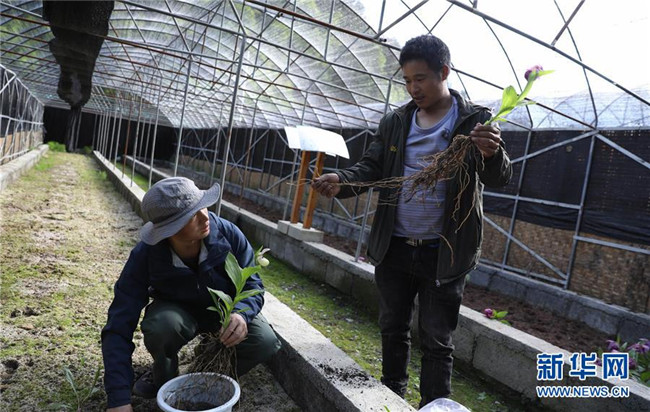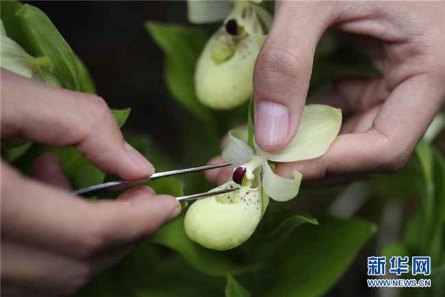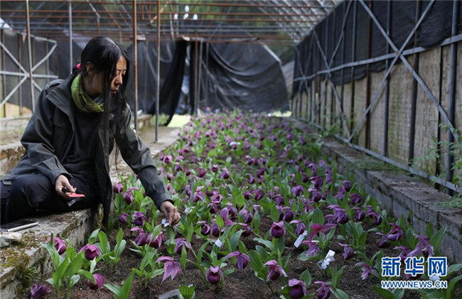 6月12日,在四川黃龍管理局花卉培育基地,四川黃龍自然保護(hù)區(qū)的高級(jí)顧問(wèn)干文清在給人工保育的杓蘭標(biāo)注標(biāo)識(shí)。  新華社記者江宏景攝