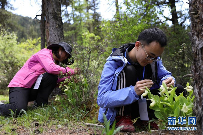 6月12日,在四川黃龍自然保護(hù)區(qū)黃龍溝,來(lái)自北京植物園的研究員徐可(右)和王濤在給黃花杓蘭進(jìn)行異花授粉。新華社記者江宏景攝