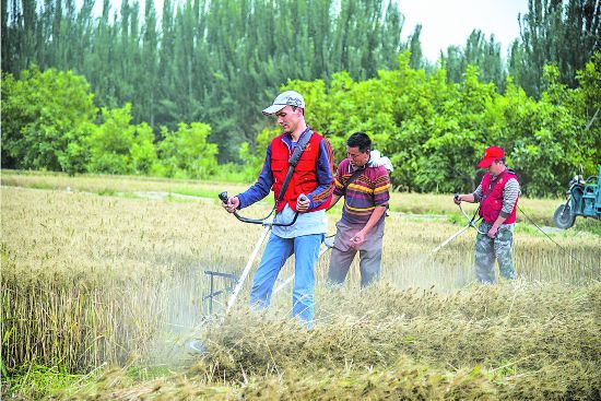 6月13日,新疆洛浦縣衛(wèi)生健康委員會駐該縣多魯鄉(xiāng)墩阿孜瑪村“訪惠聚”工作隊,帶領志愿者服務隊幫助村民收割小麥。 據(jù)了解,洛浦縣今年小麥種植面積18萬畝,截至目前已收割7萬余畝。買買提艾力·艾尼瓦爾 攝