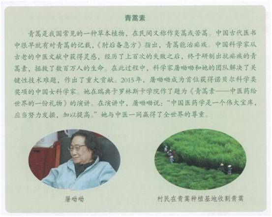 此外,初中歷史教材也在《中國歷史》八年級(jí)下冊第18課“科技文化成就”中,對屠呦呦科研團(tuán)隊(duì)先進(jìn)事跡進(jìn)行了專題介紹。