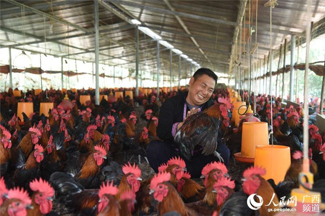 潞城瑤族鄉(xiāng)豐防村黨支部書記梁少生對(duì)養(yǎng)殖雞進(jìn)行悉心管護(hù)