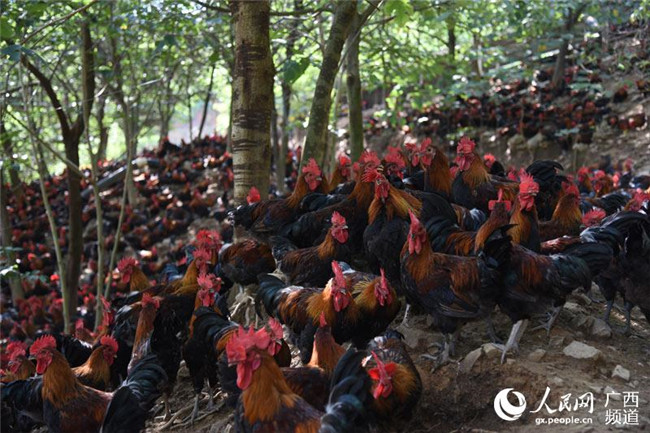 6月18日,在廣西田林縣潞城瑤族鄉(xiāng)豐防村的林下養(yǎng)雞養(yǎng)殖場(chǎng),一群群瑤土雞來回踱步,在林間或雞棚覓食。一見到生人,便飛快地跑向密林深處,響起一陣此起彼伏的叫聲。