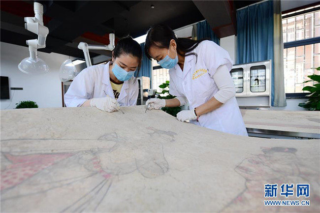 在洛陽(yáng)市文物考古研究院,西北大學(xué)文物保護(hù)技術(shù)專業(yè)學(xué)生田丹玉(左)和壁畫(huà)修復(fù)師田玉娥清理一件唐代壁畫(huà)(5月22日攝)。新華社記者李一博攝