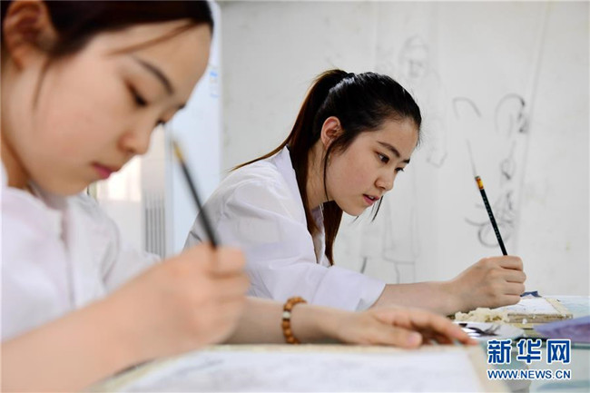 在洛陽(yáng)市文物考古研究院,西北大學(xué)文物保護(hù)技術(shù)專業(yè)學(xué)生田丹玉(右)和梁楚昕在臨摹壁畫(huà)(5月22日攝)。新華社記者李一博攝