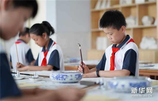 6月26日,內(nèi)丘縣實(shí)驗(yàn)小學(xué)老師在指導(dǎo)學(xué)生練習(xí)國畫創(chuàng)作。新華社記者 朱旭東 攝
