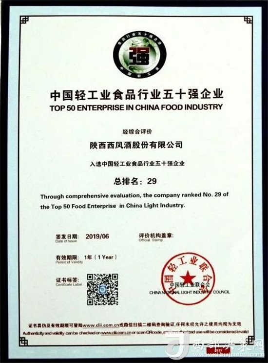 “中國輕工業(yè)食品行業(yè)五十強(qiáng)企業(yè)”榜單是評價(jià)輕工業(yè)食品企業(yè)競爭力的權(quán)威榜單,也是衡量中國輕工業(yè)食品企業(yè)發(fā)展活力的重要標(biāo)準(zhǔn)。此次榜單在評選標(biāo)準(zhǔn)上重點(diǎn)考量了2018年度參評企業(yè)的營業(yè)收入、利潤總額、營業(yè)收入利潤率、稅收占利稅比重、研發(fā)投入及營業(yè)收入增速六項(xiàng)指標(biāo)綜合評分,力求結(jié)合互聯(lián)網(wǎng)時(shí)代特征對企業(yè)進(jìn)行充分全面的評估,要求企業(yè)不僅能夠?qū)崿F(xiàn)均衡發(fā)展,還要具備較強(qiáng)的市場活力。西鳳股份公司憑借出色的經(jīng)營業(yè)績和綜合表現(xiàn),獲得了大會(huì)的一致認(rèn)可。