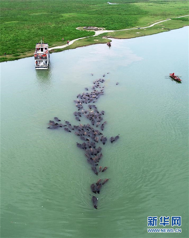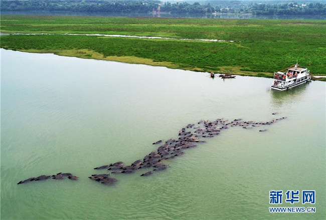 7月2日傍晚,在四川省南充市蓬安縣油房溝村,百余頭水牛橫渡嘉陵江歸欄(無人機拍攝)。新華社發(fā)(劉永紅攝)