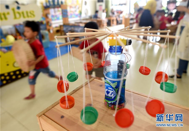 這是7月4日拍攝的德清縣乾元鎮(zhèn)第一幼兒園展示的小朋友通過廢物回收制作的手工作品。新華社記者 林善傳 攝