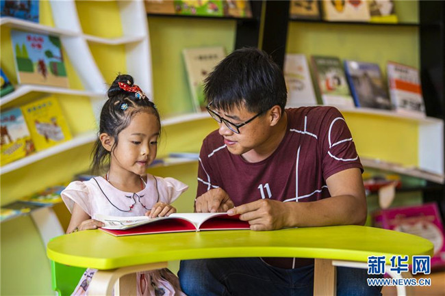 7月9日,在河北省衡水市武邑縣新華書店,小朋友在家長陪伴下讀書。 新華社記者 李曉果 攝