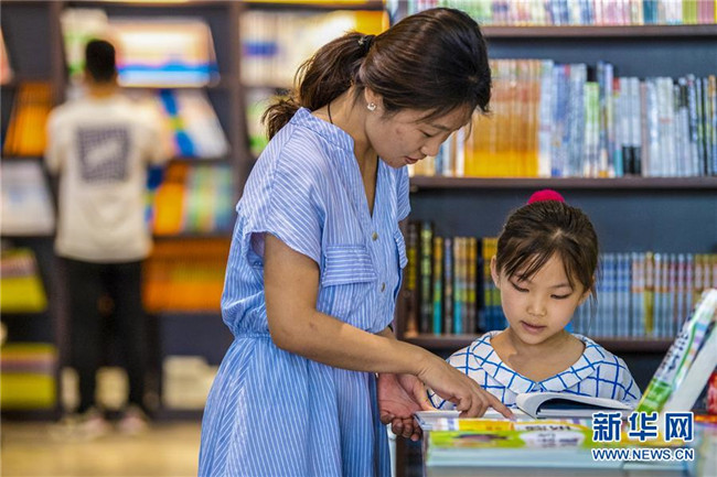 7月9日,在河北省衡水市武邑縣新華書店,小朋友在家長陪伴下讀書。新華社記者 李曉果 攝