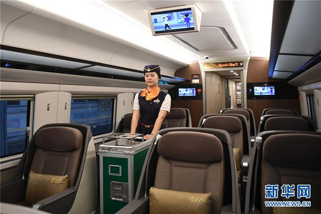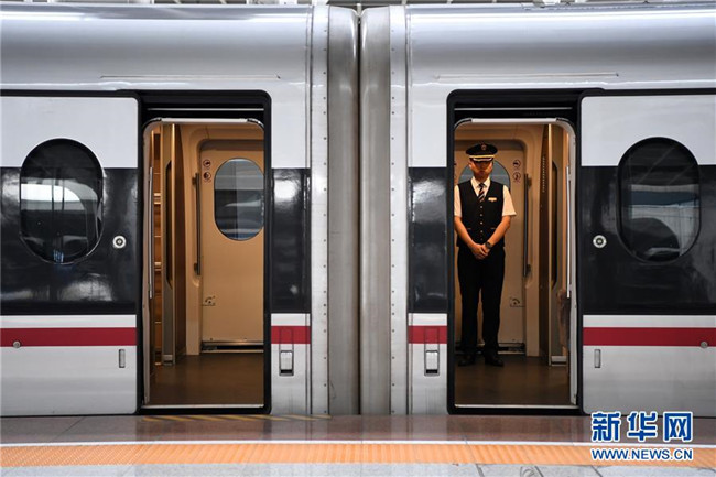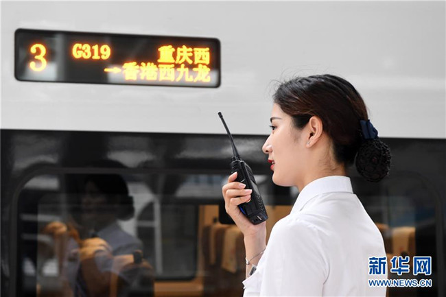 7月11日,乘務(wù)員在G319次列車(chē)上做發(fā)車(chē)前的準(zhǔn)備工作。當(dāng)日,重慶至香港直達(dá)高鐵正式開(kāi)通,此次首發(fā)的G319次復(fù)興號(hào)列車(chē)運(yùn)行速度350km/h,沿途經(jīng)停遵義、貴陽(yáng)東、桂林西、肇慶東、廣州南和深圳北站。列車(chē)由重慶西站至香港西九龍站全程運(yùn)行需7小時(shí)37分鐘,全程票二等座票價(jià)為660元。目前內(nèi)地與香港聯(lián)通的高鐵車(chē)站已增加到58個(gè)。新華社記者唐奕攝