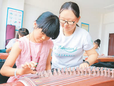 圖為志愿者指導(dǎo)實(shí)驗(yàn)小學(xué)鄉(xiāng)村少年宮孩子們練習(xí)古箏。(來(lái)源:人民圖片)