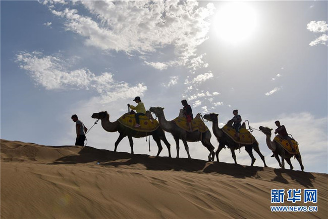 游客在新疆鄯善縣庫木塔格沙漠風(fēng)景區(qū)體驗(yàn)騎駱駝(7月2日攝)。