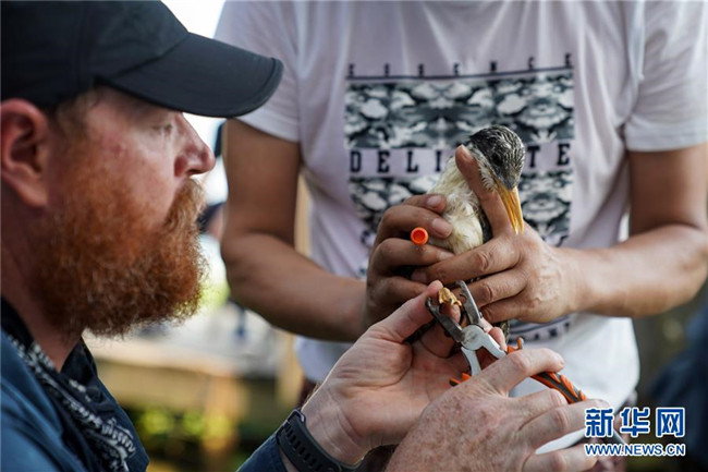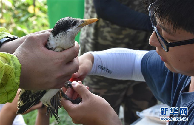 7月25日,美國鳥類保護專家在浙江韭山列島國家級自然保護區(qū)為一只鳳頭燕鷗幼鳥戴上標(biāo)志。新華社記者 殷曉圣 攝