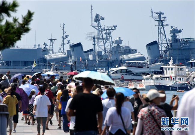 8月6日,游客前往青島海軍博物館參觀。 暑期旅游旺季,海濱城市青島各景區(qū)、景點游人如織。 新華社記者 李紫恒 攝