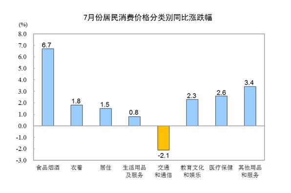 7月份,食品煙酒價(jià)格同比上漲6.7%,影響CPI(居民消費(fèi)價(jià)格指數(shù))上漲約1.95個(gè)百分點(diǎn)。其中,鮮果價(jià)格上漲39.1%,影響CPI上漲約0.63個(gè)百分點(diǎn);畜肉類價(jià)格上漲18.2%,影響CPI上漲約0.75個(gè)百分點(diǎn)(豬肉價(jià)格上漲27.0%,影響CPI上漲約0.59個(gè)百分點(diǎn));雞蛋價(jià)格上漲11.4%,影響CPI上漲約0.06個(gè)百分點(diǎn);禽肉類價(jià)格上漲7.6%,影響CPI上漲約0.09個(gè)百分點(diǎn);鮮菜價(jià)格上漲5.2%,影響CPI上漲約0.12個(gè)百分點(diǎn);糧食價(jià)格上漲0.6%,影響CPI上漲約0.01個(gè)百分點(diǎn)。