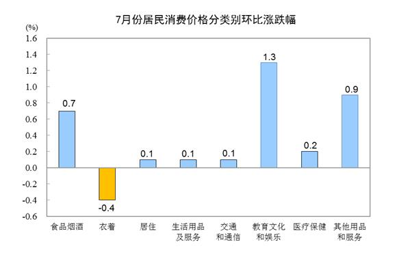 7月份,全國(guó)居民消費(fèi)價(jià)格環(huán)比上漲0.4%。其中,城市上漲0.4%,農(nóng)村上漲0.3%;食品價(jià)格上漲0.9%,非食品價(jià)格上漲0.3%;消費(fèi)品價(jià)格上漲0.2%,服務(wù)價(jià)格上漲0.7%。