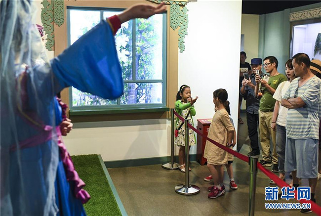 文藝揚在新疆博物館民俗展廳中為游客做講解(8月8日攝)。 新華社記者 王菲 攝