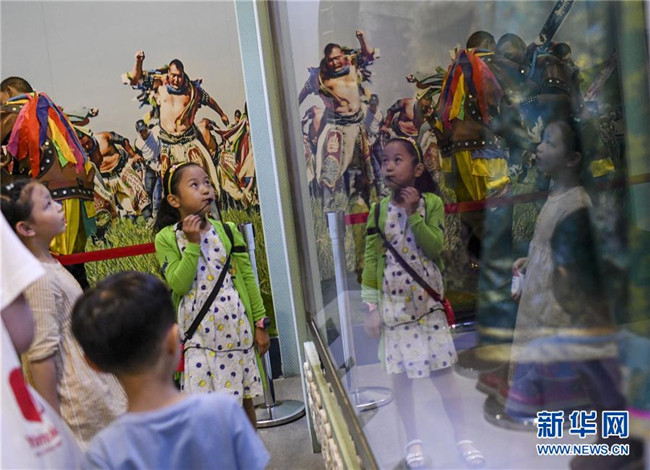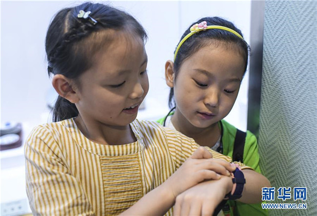 在新疆博物館的講解結(jié)束后,一名小游客通過電話手表和文藝揚(右)合影留念(8月8日攝)。 新華社記者 王菲 攝