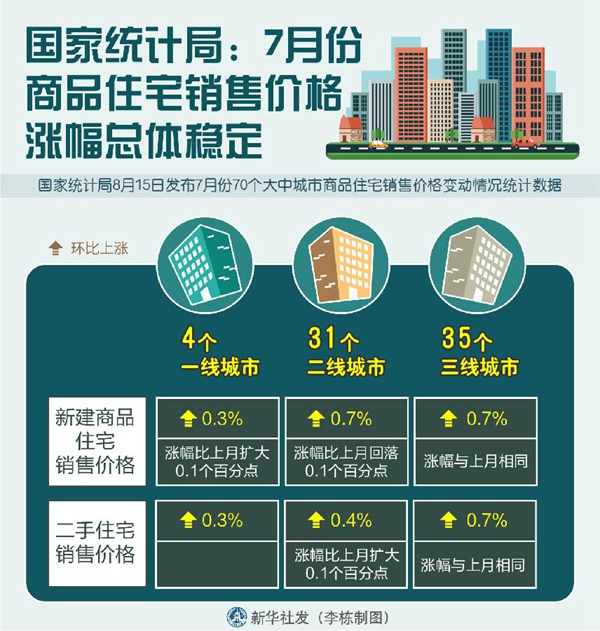 國家統(tǒng)計局15日發(fā)布7月份70個大中城市商品住宅銷售價格變動情況統(tǒng)計數(shù)據(jù)。統(tǒng)計顯示,7月份,商品住宅銷售價格漲幅總體穩(wěn)定。從同比看,一二三線城市新建商品住宅和二手住宅銷售價格同比漲幅不同程度回落,或與上月相同。