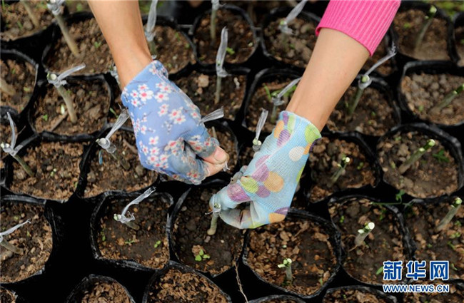 在廣西融安縣大良鎮(zhèn)古蘭村古蘭屯大棚基地,村民在嫁接金桔苗(4月12日攝)。新華社記者 黃孝邦 攝