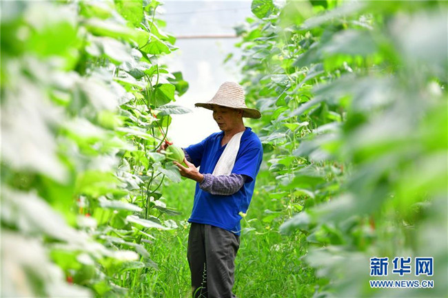 在廣西融安縣大良鎮(zhèn)古蘭村古蘭屯大棚基地,62歲的黃顯亮查看甜瓜生長(zhǎng)情況(8月18日攝)。黃顯亮是大棚基地的技術(shù)員,每個(gè)月有3000多元的工資,已于2018年實(shí)現(xiàn)脫貧。 新華社記者 黃孝邦 攝