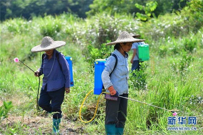 在廣西融安縣大良鎮(zhèn)古蘭村古蘭屯金桔種植基地,村民在田間管護(hù)金桔樹(8月18日攝)。 新華社記者 黃孝邦 攝