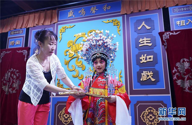 8月20日,河北省秦皇島市北戴河“裴艷玲藝術(shù)傳承基地”的老師在培訓(xùn)孩子表演京劇。